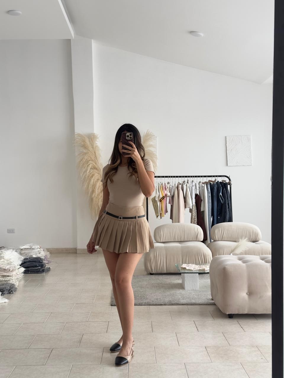 FALDA SHORT CAFÉ PRENSES CON CORREA